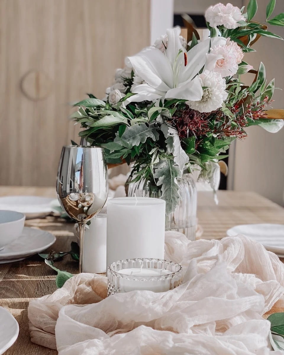 Kremowa barwa jest cieplejsza od bieli, dzięki czemu tworzy atmosferę przytulnego luksusu i stanowi doskonałe tło dla żywych kwiatów oraz złotych dodatków.