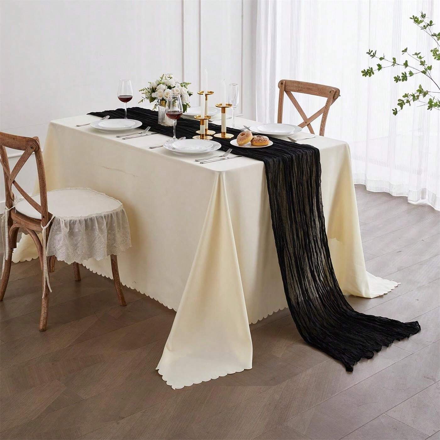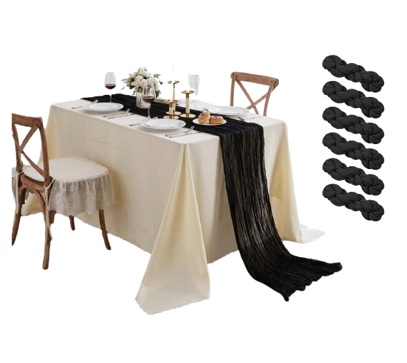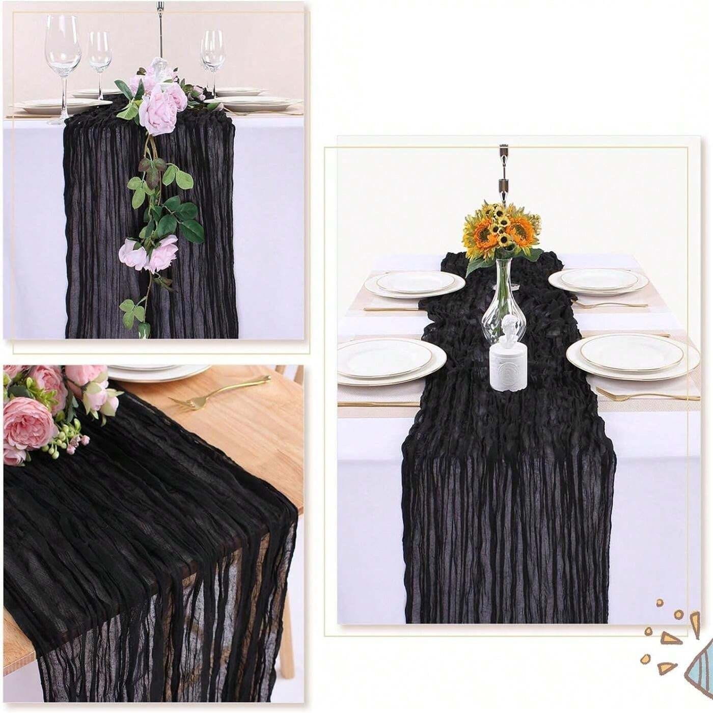 BIEŻNIK BOHO CZARNY MARSZCZONY DEKORACJA STOŁU 300 x 90 cm