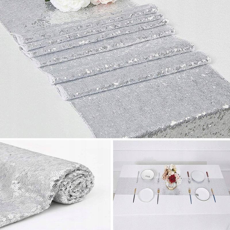 Ten srebrny bieżnik cekinowy to niezastąpiony element dekoracyjny na: