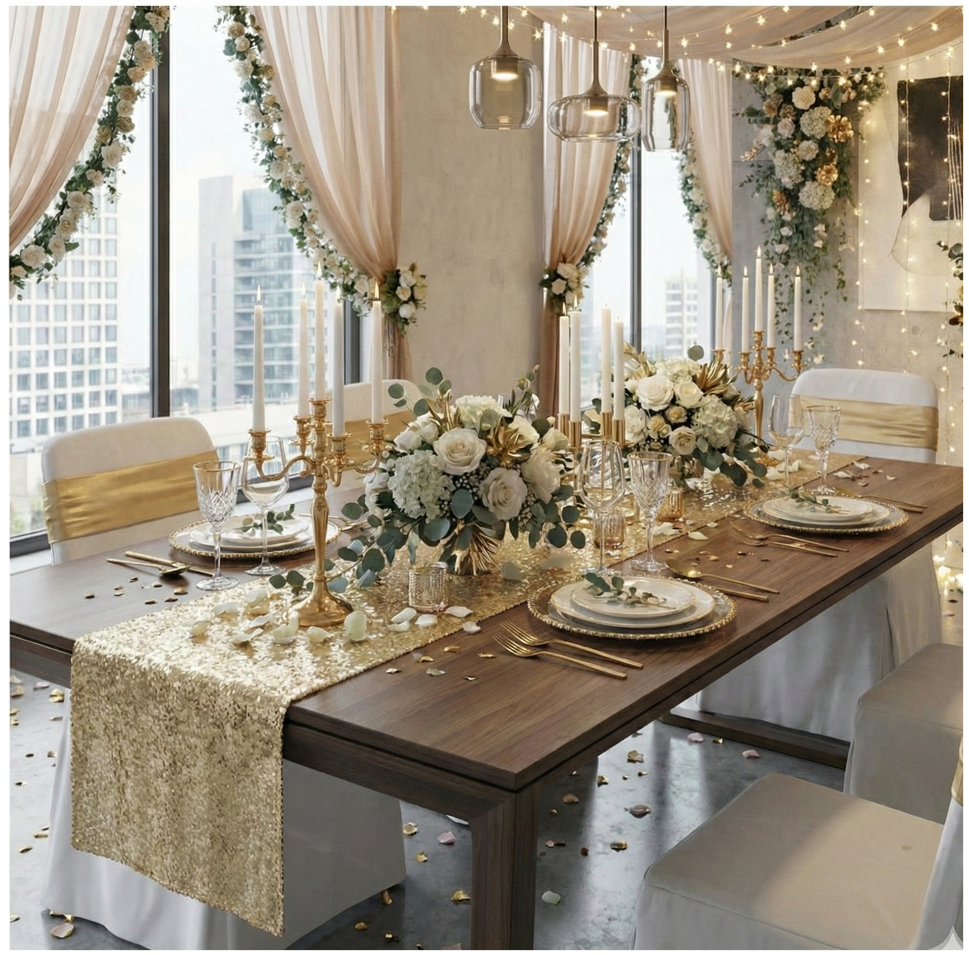 Dodaj swojemu przyjęciu spektakularnego blasku i królewskiej elegancji dzięki naszemu cekinowemu bieżnikowi w kolorze szampańskiego złota. To idealny wybór na wesela, bankiety czy prestiżowe jubileusze dla osób szukających szlachetnych i luksusowych akcentów. Ten wyjątkowo piękny, jasny odcień złota w połączeniu z gęsto rozmieszczonymi cekinami zjawiskowo mieni się w świetle, nadając aranżacji niezwykle wyrafinowanego, świetlistego i ekskluzywnego charakteru.