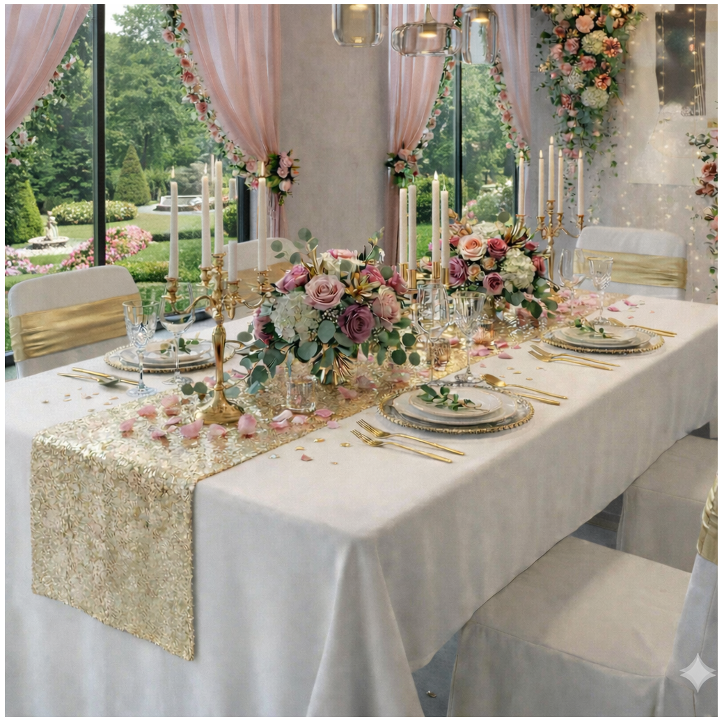 Ten szampański bieżnik cekinowy to niezastąpiony element dekoracyjny na: