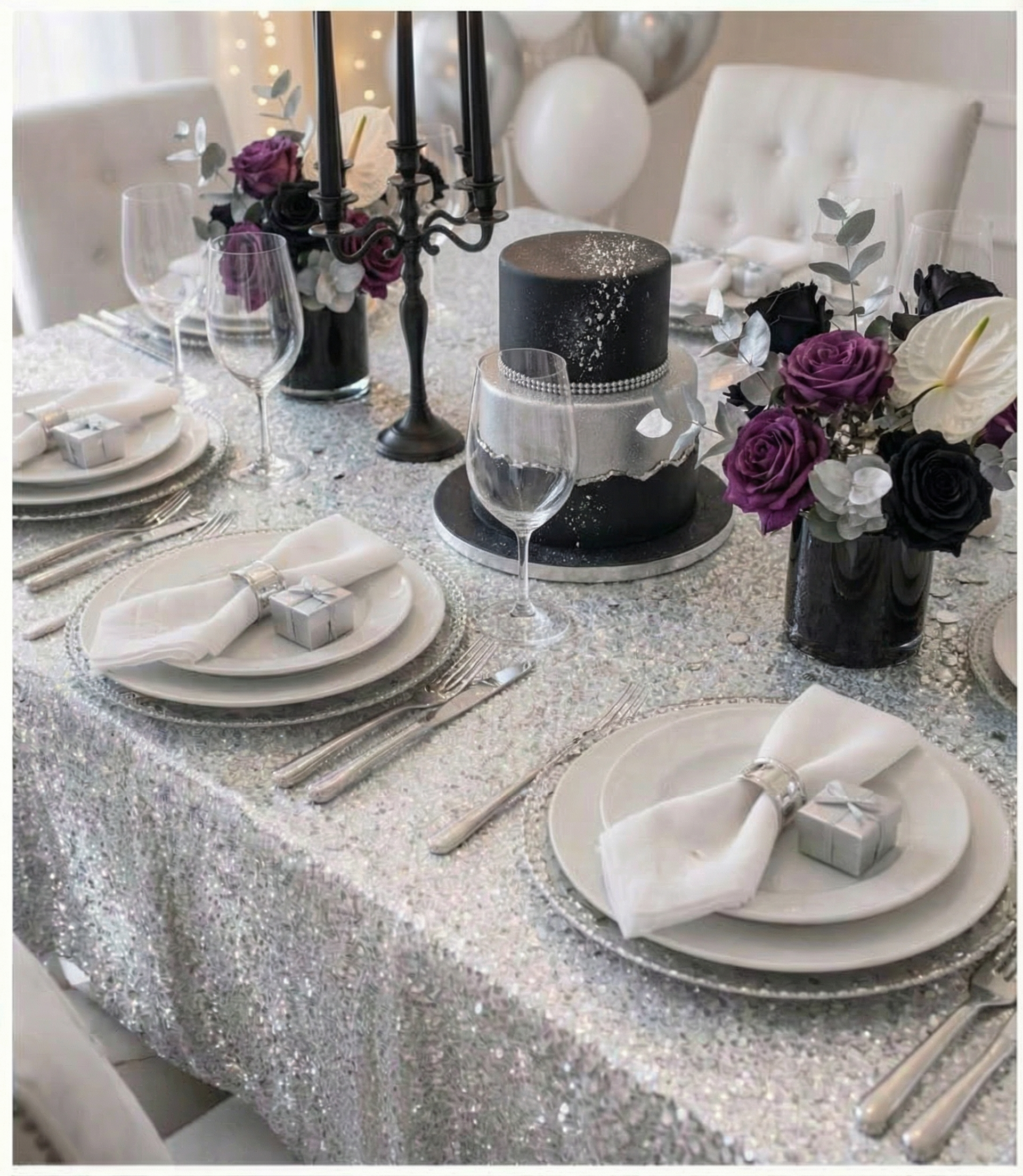 Ten srebrny obrus cekinowy to niezastąpiony element dekoracyjny na wszelkiego rodzaju przyjęcia, bankiety oraz wesela. Świetnie sprawdzi się jako stylowa baza na "słodkich stołach" (candy bar). Wysoka jakość materiału i staranne wykończenie przyciągną wzrok każdego z gości, nadając spotkaniu wyjątkową oprawę.