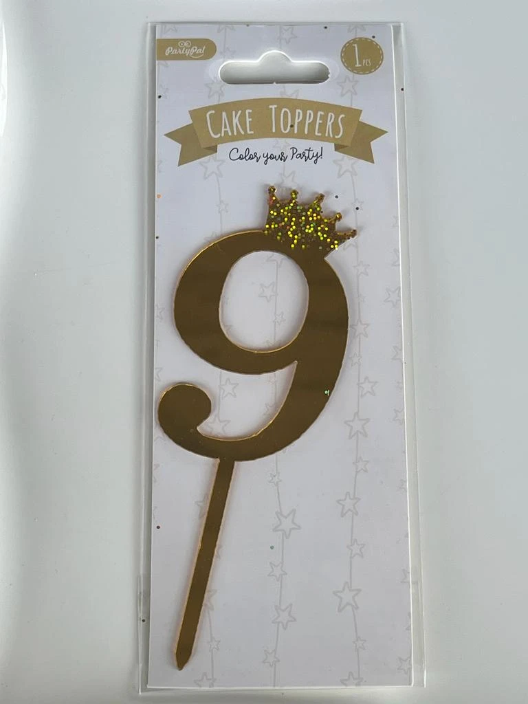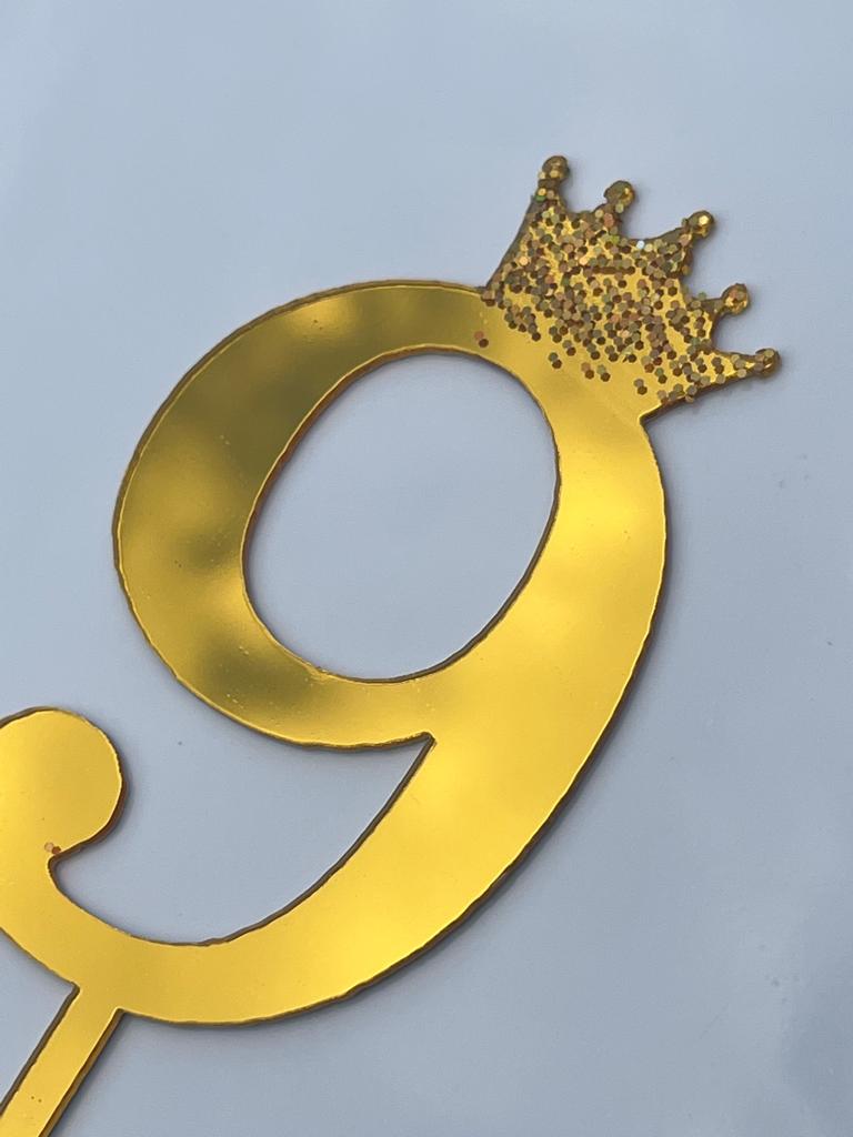 PIĘKNY ZŁOTY TOPPER NA TORT - CYFRA 9 ZE ZŁOTĄ BROKATOWĄ KORONĄ